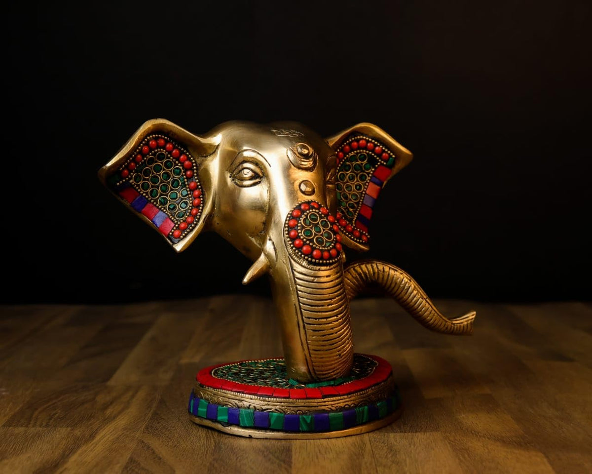 Mridaya Brass Ganesha Head Statue With Basestonework, 23 Cm Brass Ganesh Statue, Ganpati Idol, Good Luck Gift For New Beginnings, House Warming Gift.