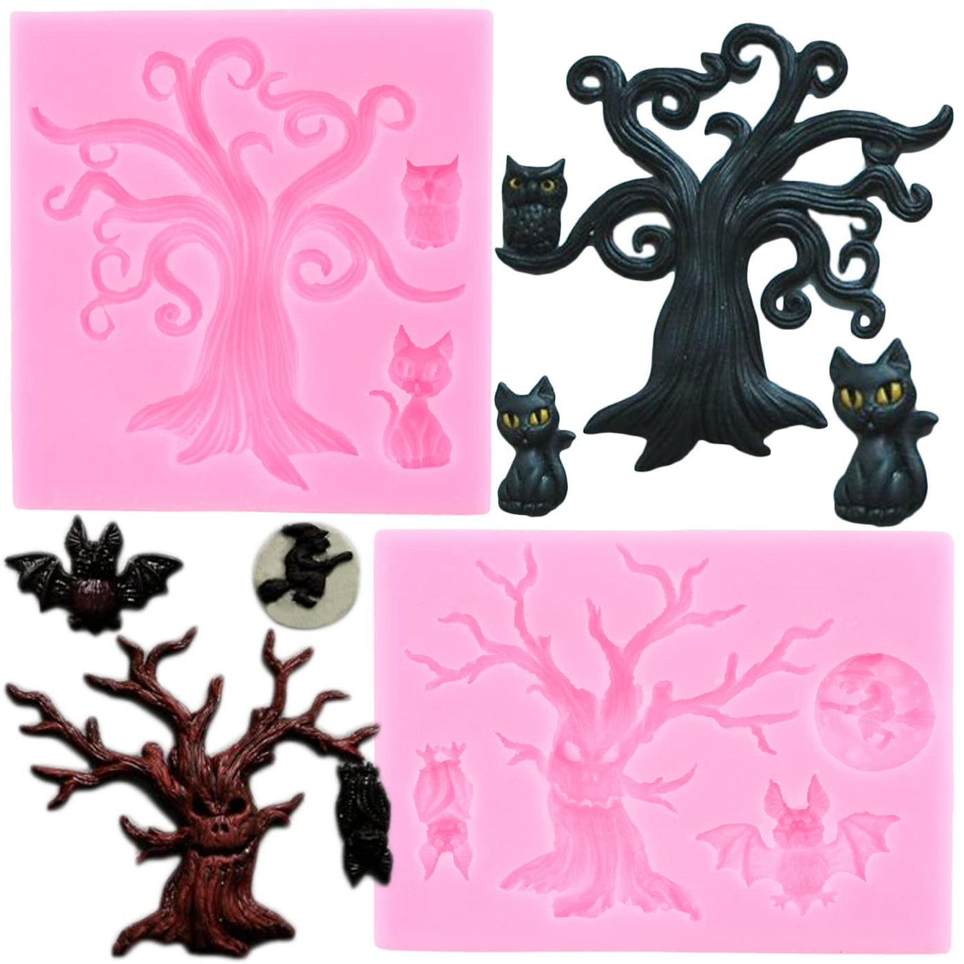 Mujiang Halloween Tree Cat Owl Silicone Mold Witch Bat Fondant Mold For Cake Decorating Candy Chocolate Polymer Clay Gum Paste S