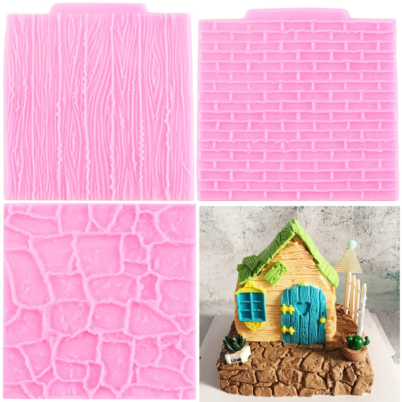 • Q: What are the dimensions of each mold in the set? A: The set includes three molds: Brick Wall Texture mold (3.78 x 4.01 inches), Tree Bark Texture mold (3.74 x 4.06 inches), and Rock Brick Texture mold (3.89 x 3.89 inches).