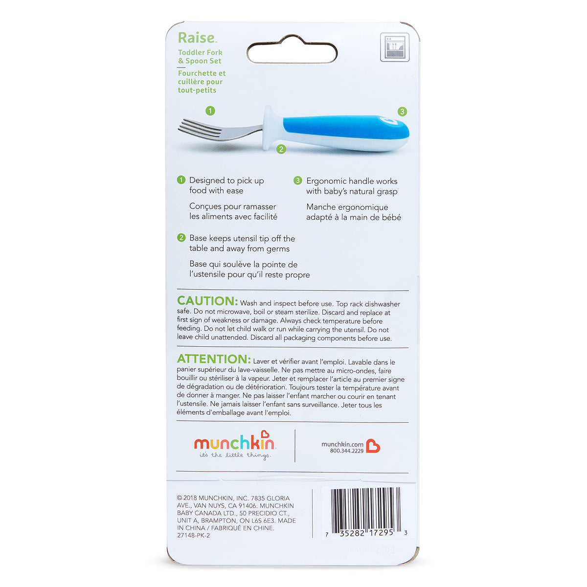 • Q: Does the utensil set come in different colors? A: Yes, the Munchkin® Raise™ Toddler Fork and Spoon Utensil Set is available in a blue and green color combination.