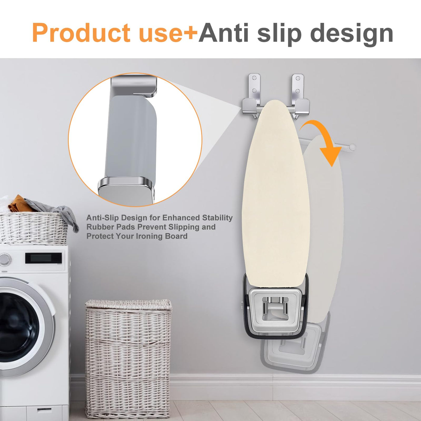 • Q: How does the anti-slip design work? A: The anti-slip design features rubber pads that securely grip your ironing board, preventing it from slipping or sliding when stored.