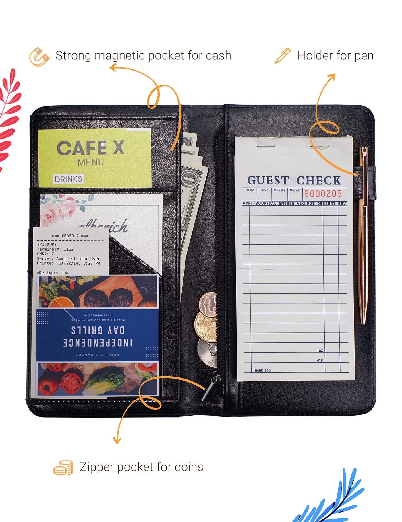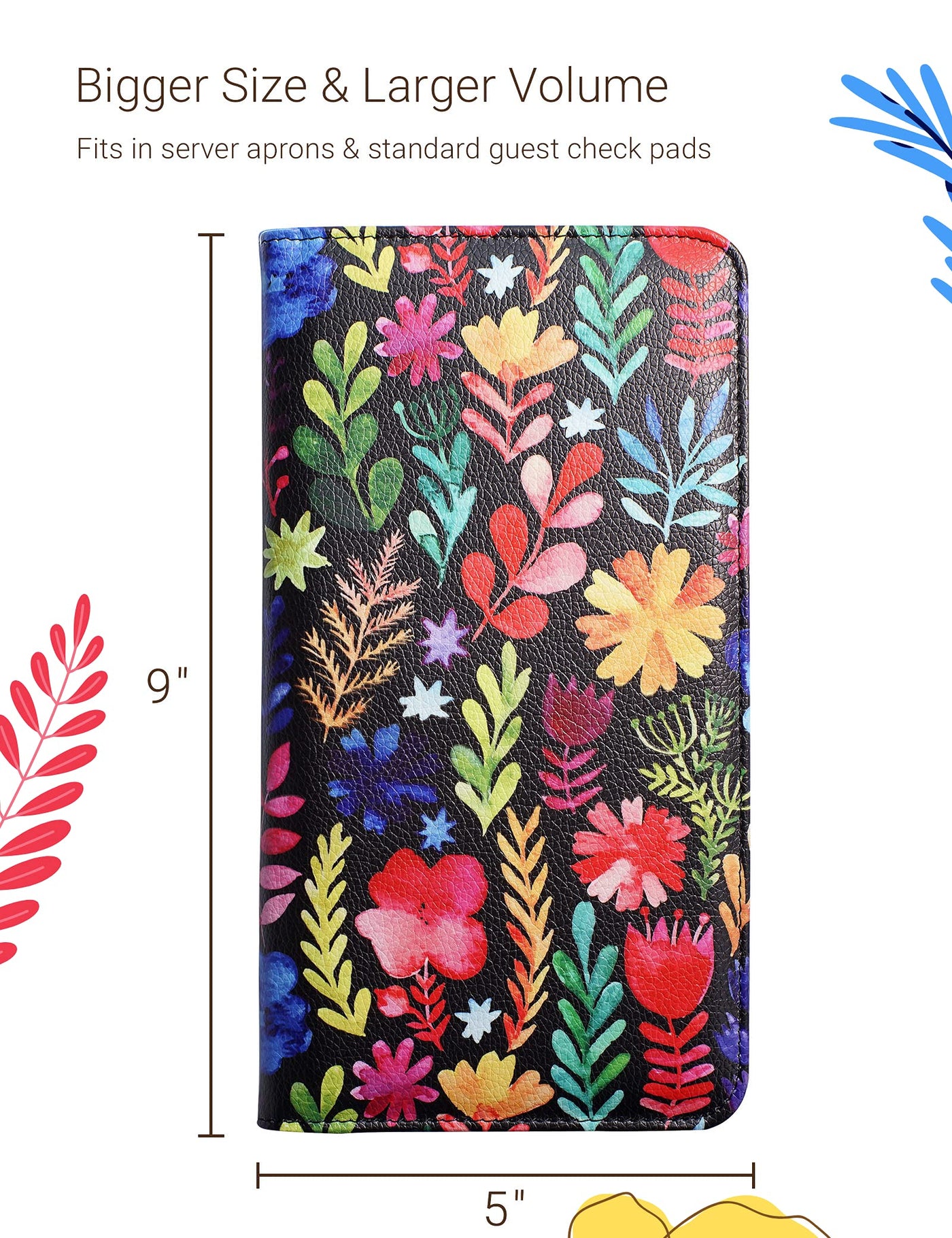 Mymazn Server Book For Waitress, 5X9 Server Book With Zipper, Magnetic Pocket, Pen Holder, Black Server Book With Flower Pattern