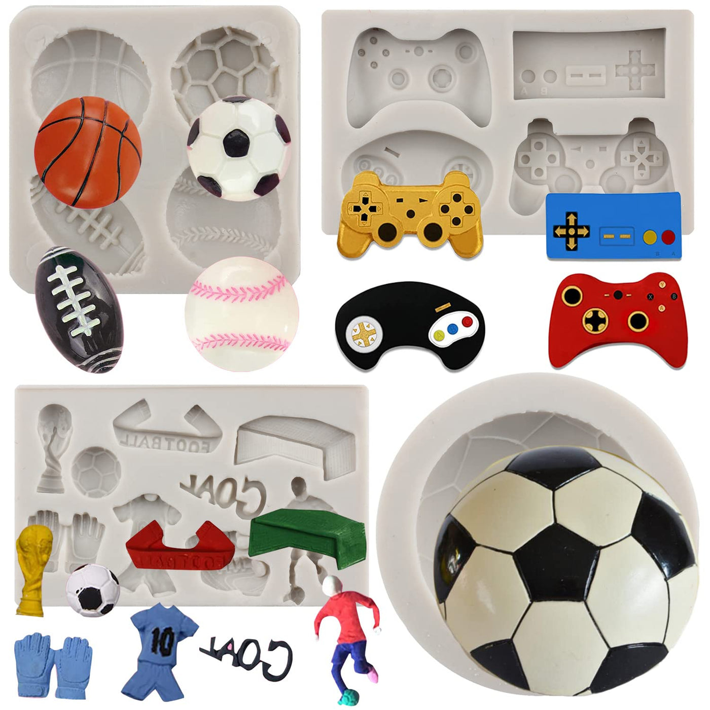 • Q: How many molds are included in this set? A: The set includes 4 different molds: a Game Controller mold, a Football mold, a Basketball mold, and a Football Themed mold.
