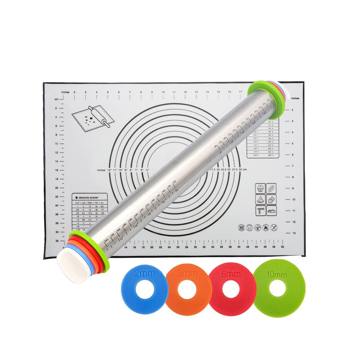 - Q: What are the dimensions of the rolling pin and baking mat? A: The rolling pin measures 17.1 inches in length and 2.4 inches in diameter, while the baking mat measures 23.6 inches by 15.7 inches.