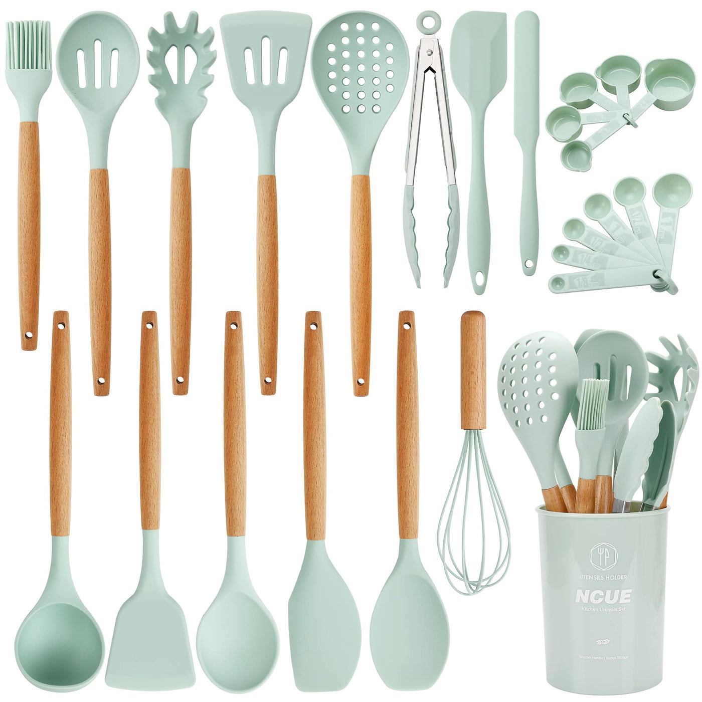 Ncue Kitchen Utensils Set, 26 Pcs Bpa Free Non-Stick Silicone Cooking Kitchen Utensils Set With Holder, Wooden Handle Heat Resis