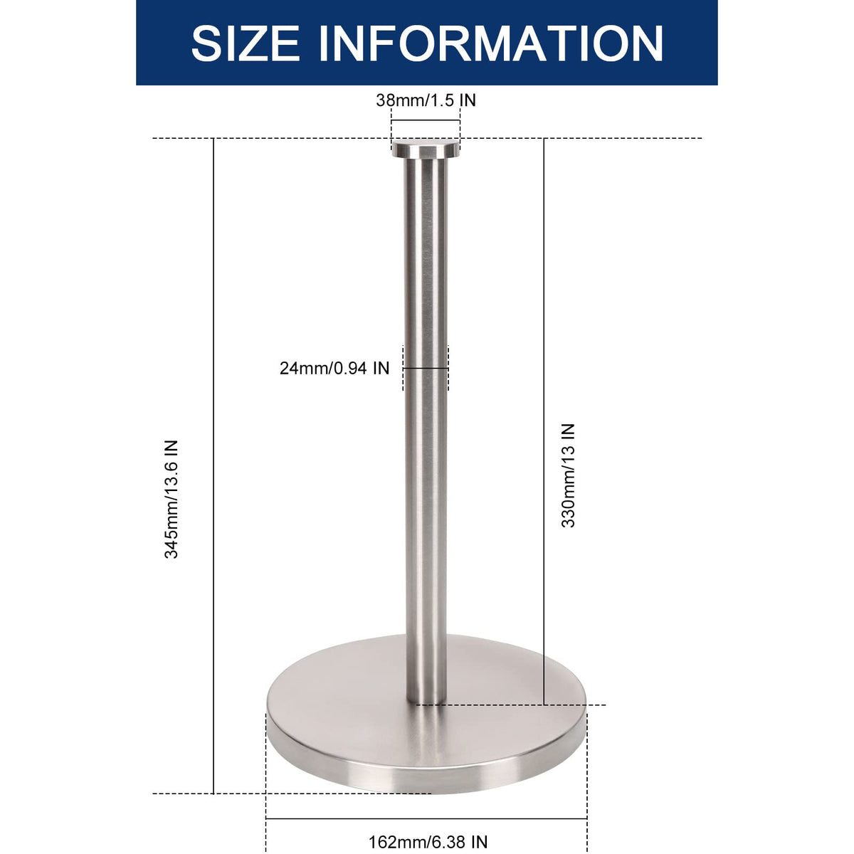 - Q: What are the dimensions of the paper towel holder? A: The specifications for the dimensions are not provided, but it is designed to fit standard and jumbo-sized rolls.