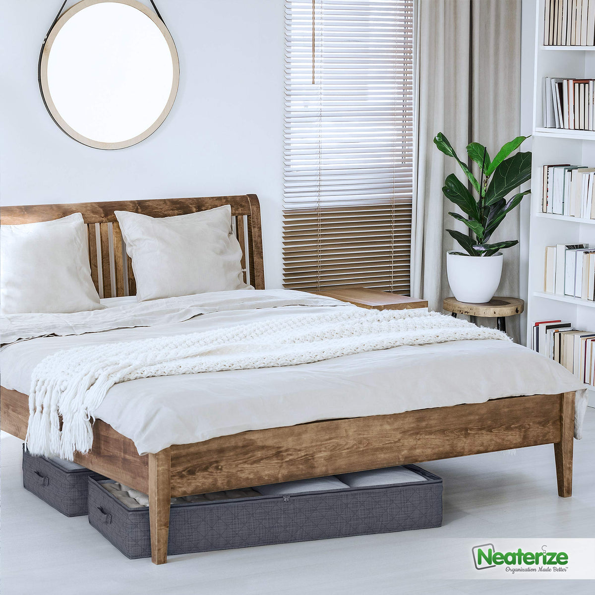 • Q: What color are the NEATERIZE storage bags available in? A: The bags come in a sleek Dark Grey color, complementing various bedroom decors.