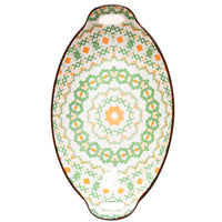 DescriptionMandala long dishes are made entirely of ceramic and are provided with handles which have a Mandala design on the inside and a solid white outer surface. The handle of the long dishes make them simple to pick up and serve at a table. The long serving dishes may be used as platters to serve starters or snacks, salad bowls, fruit platters, noodle bowls, rice bowls. The ceramic long plates have a depth and can be used in the refrigerator, microwave and dishwasher, safely. There are 6 mandala prints or colors available to choose from that can easily be paired with and made into a platter set.