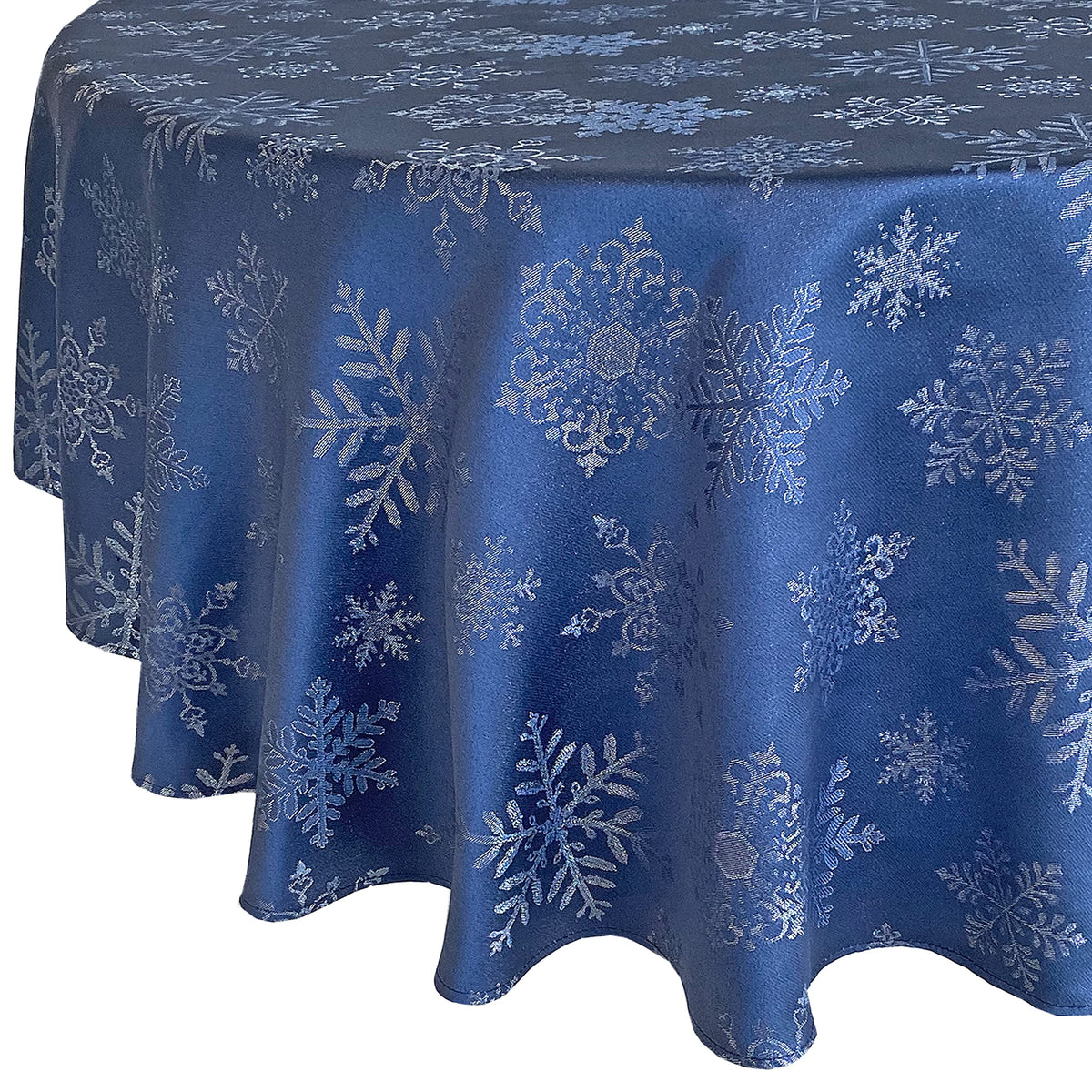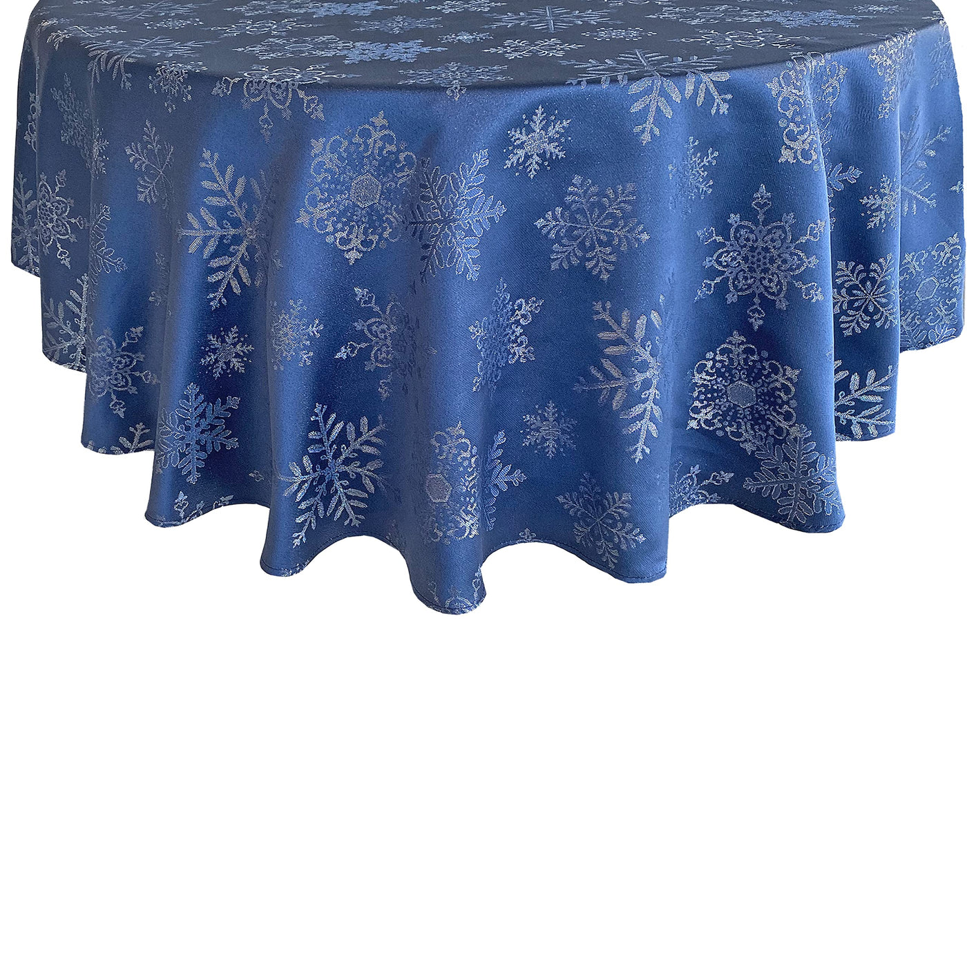 • Q: What is the design of the tablecloth? A: The tablecloth features an allover woven snowflake design with a subtle visual texture in silver metallic on a navy blue background.
