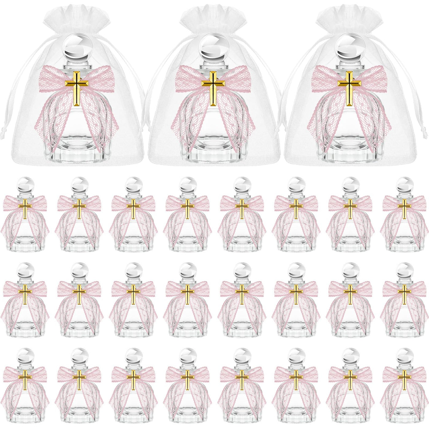 Newtay Holy Water Bottles Catholic Bulk Glass Baptism Favors for Guests Christian Water Container with Cross Organza Bags Bow fo