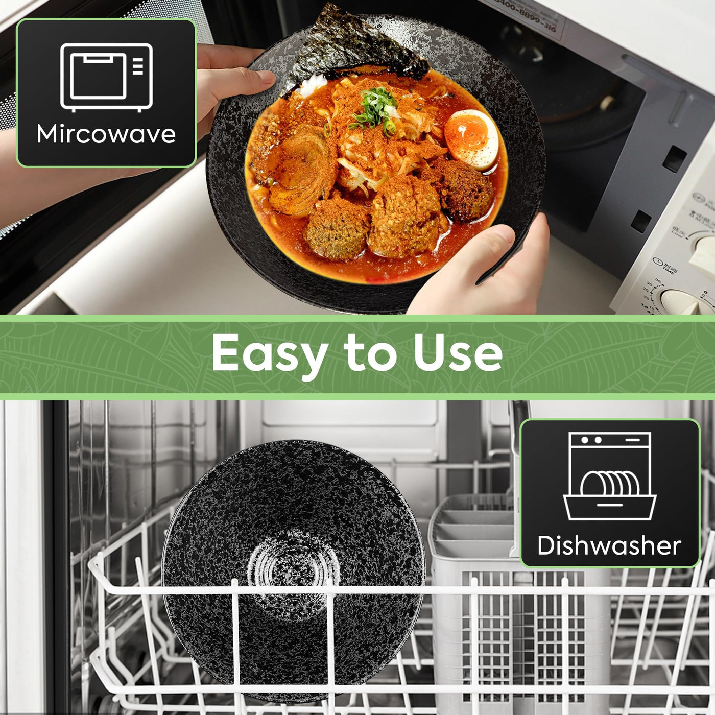 - Q: Are the NJCHARMS ramen bowls microwave safe? A: No, the NJCHARMS ramen bowls should not be used in the microwave. They are designed for easy cleaning and are dishwasher safe.