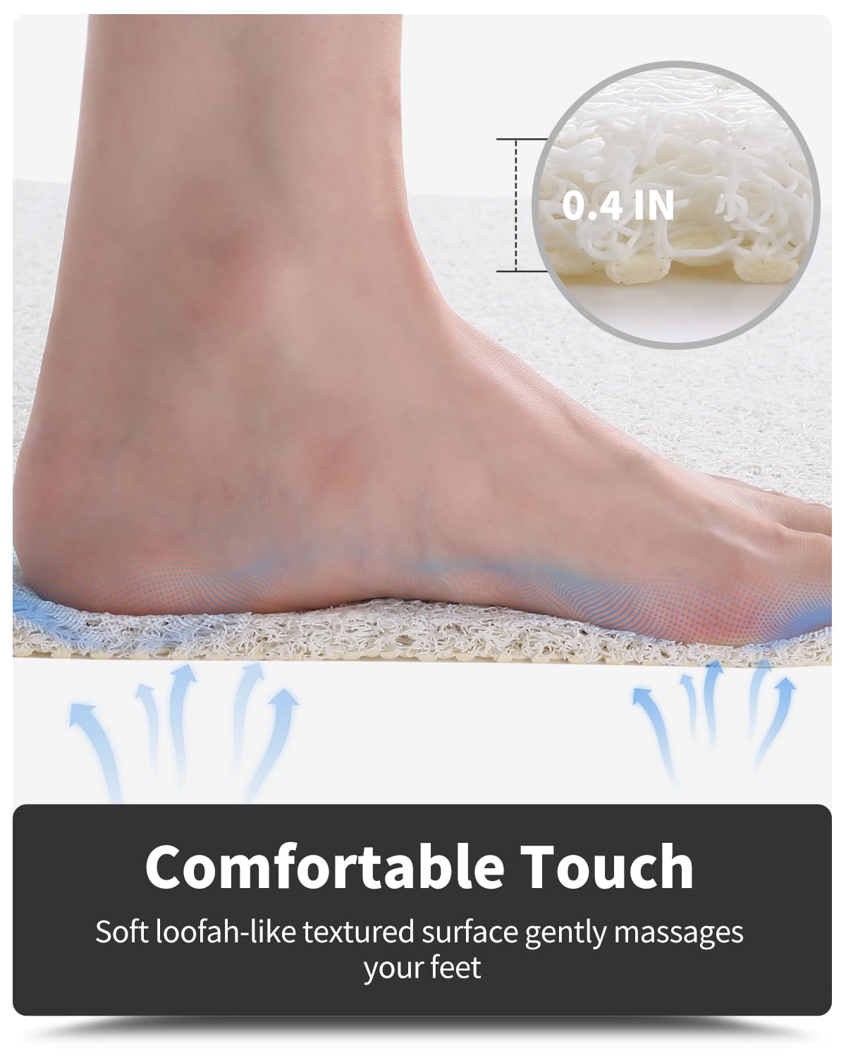 • Q: Is the surface of the mat comfortable to stand on? A: The mat features a soft loofah-like textured surface that provides comfort and gently massages the feet while standing.