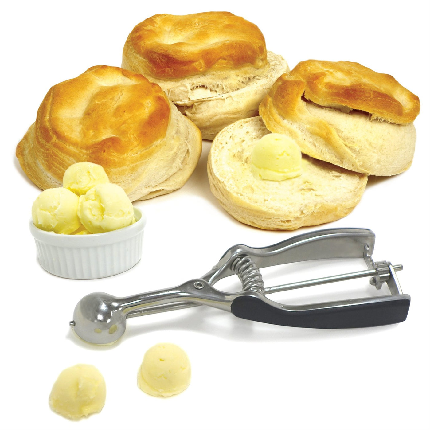 • Q: Is this scoop suitable for making cookie dough balls? A: Yes, the Norpro Grip-EZ scoop is ideal for portioning cookie dough into uniform balls, making it a great tool for baking.