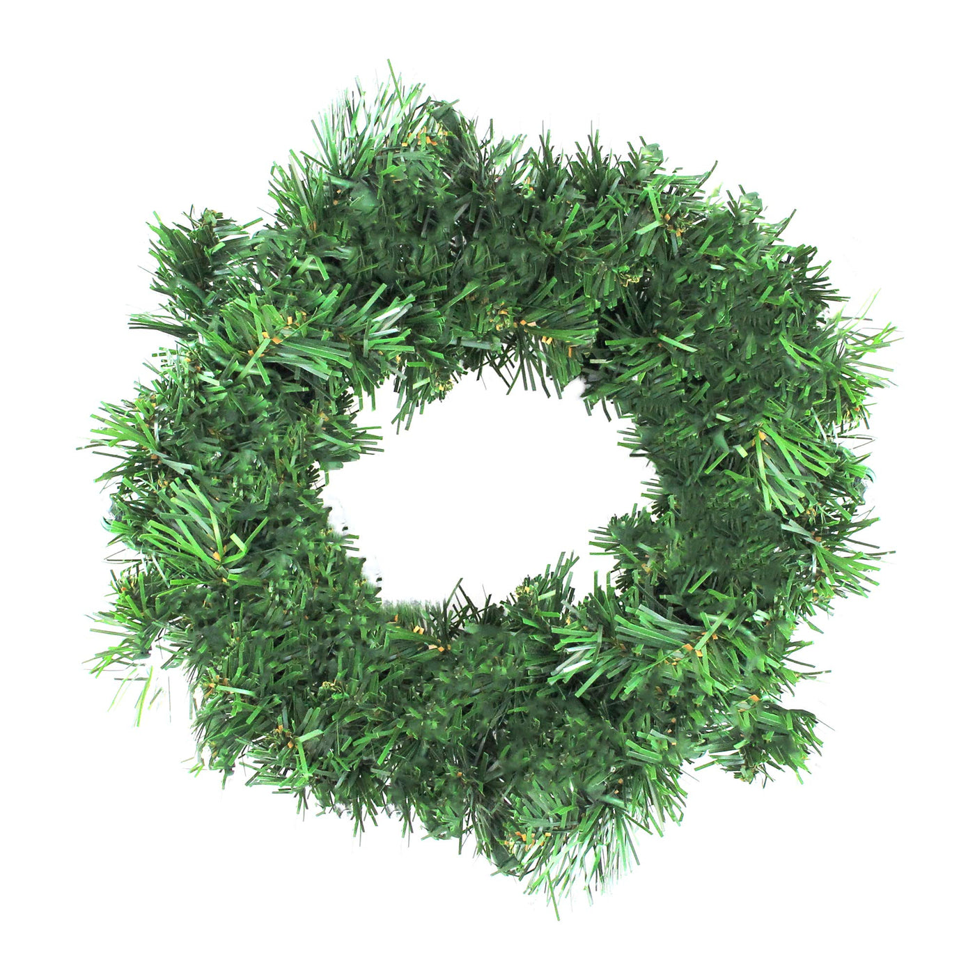 Unlit. 40 branch tips. No assembly required wreath comes in 1 section. For indoor use only. Includes a heavy duty double ring metal frame backing for hanging. Dimensions: 12 diameter (measured from outermost tip to outermost tip across the wreath). Material(s): PVC/metal
