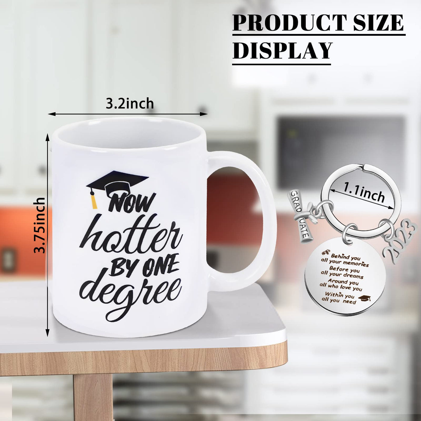 • Q: What is the design of the graduation mug? A: The mug is printed with the phrase 'Now Hot by One Degree' on the side, and it includes a delicate graduation key chain.