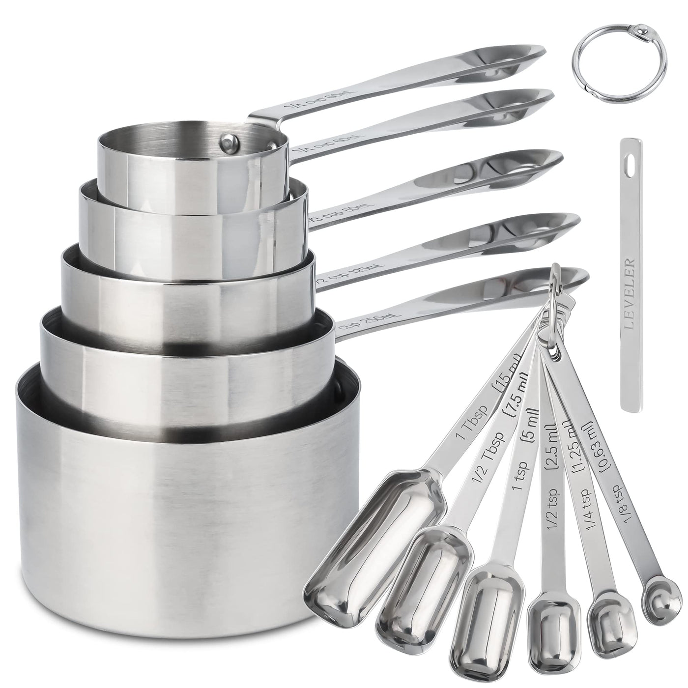 - Q: How many pieces are included in the measuring cups and spoons set? A: The set includes a total of 12 pieces: 5 measuring cups, 6 measuring spoons, and 1 leveler.
