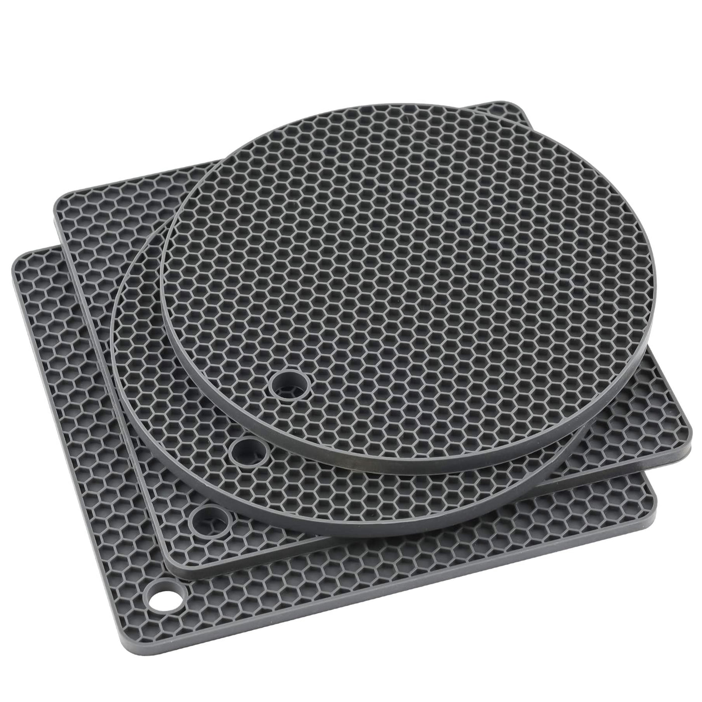 - Q: What are the dimensions or sizes of the trivets in this set? A: The set includes 4 silicone trivets: 2 round and 2 square, providing versatile options for different cookware.