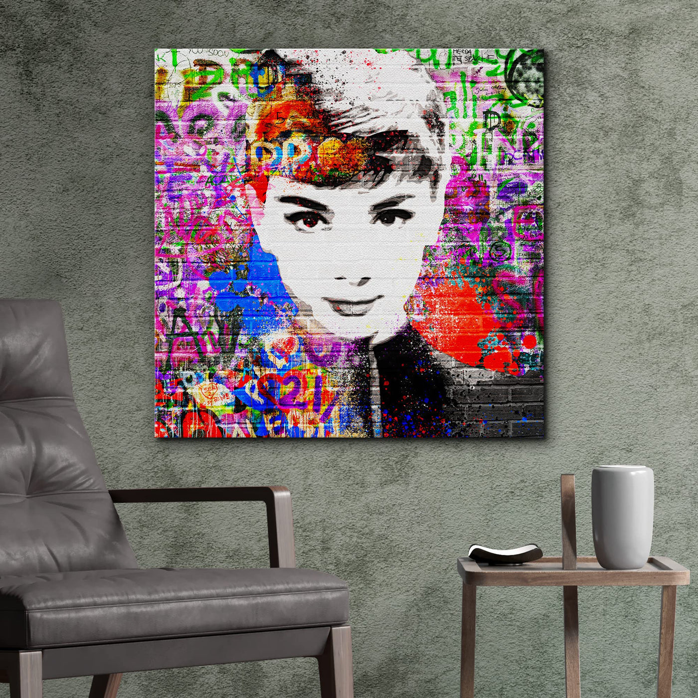 - Q: What type of artwork is featured in this print? A: The print features a graffiti and street art style portrait of Audrey Hepburn, blending modern art with abstract illustrations.
