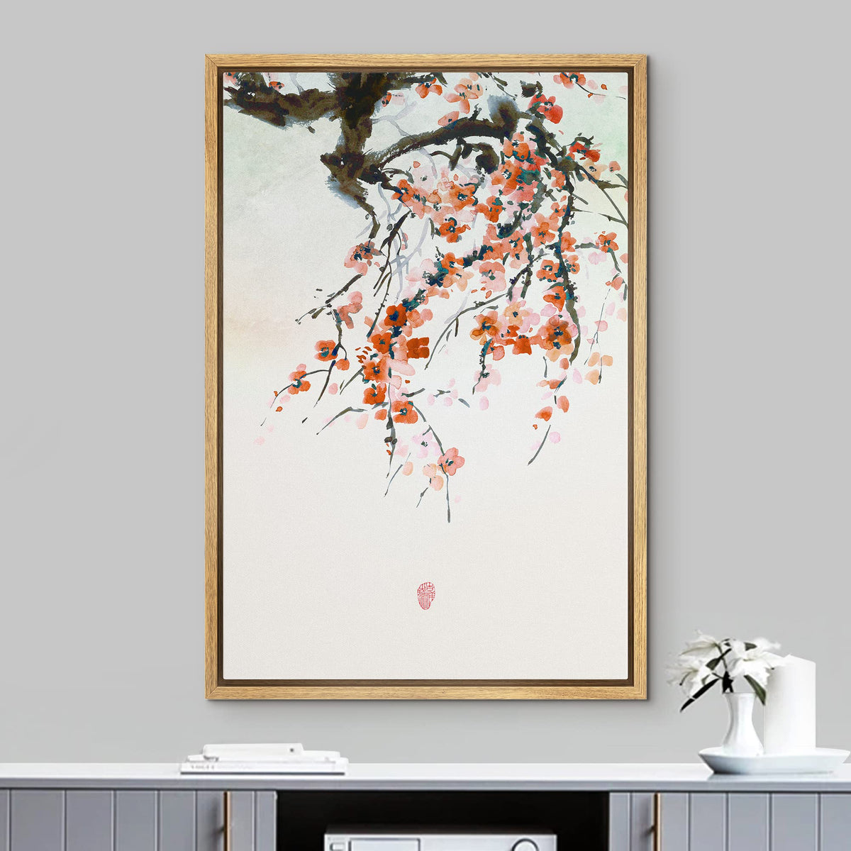 NWT Framed Canvas Print Wall Art Japanese Style Cherry Blossoms on Tree Branch Floral Plants Illustrations Modern Art Rustic Scenic Colorful Pastel for Living Room Bedroom Office - 16''x24'' Natural