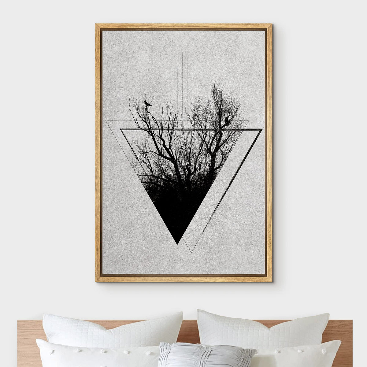 NWT Framed Canvas Print Wall Art Sketch Style Triangle Tree & Bird Silhouette Nature Wilderness Realism Minimalist Black and White for Living Room Bedroom Office - 24''x36'' Natural
