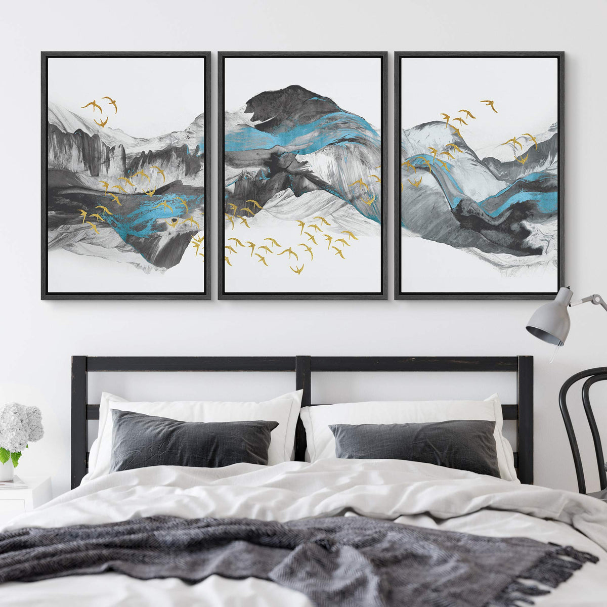 Nwt Framed Wall Art Print Set Blue & Black Mountains With Gold Birds Nature Wilderness Illustrations Modern Art Rustic Colorful