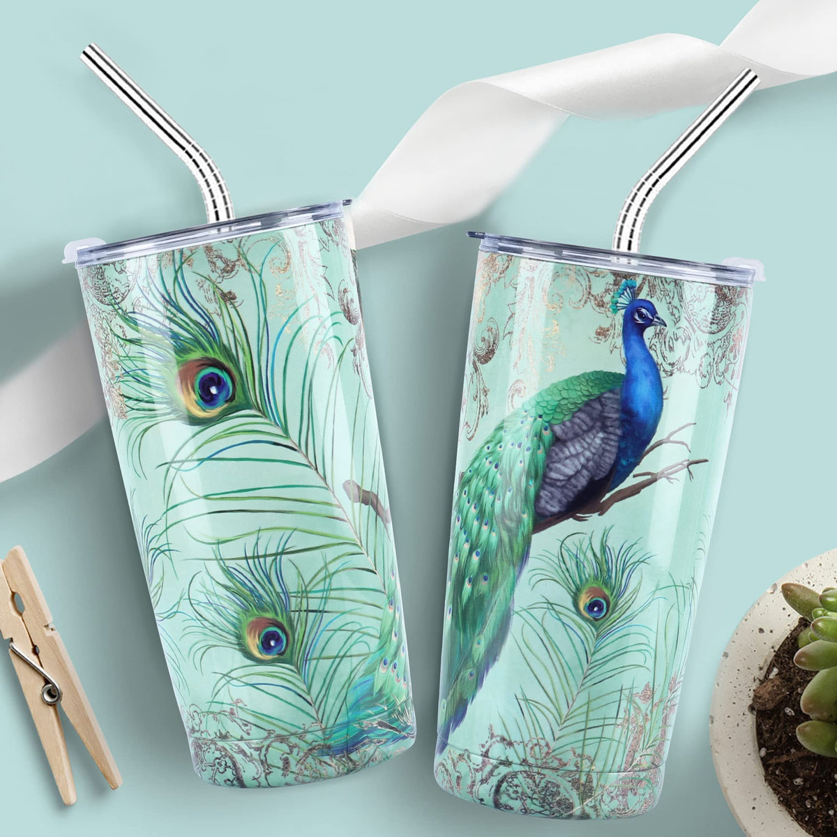 Nymphfable 20Oz Peacock Mug Tumbler With Straw And Lid Stainless Steel Insulated Travel Mug Double Wall