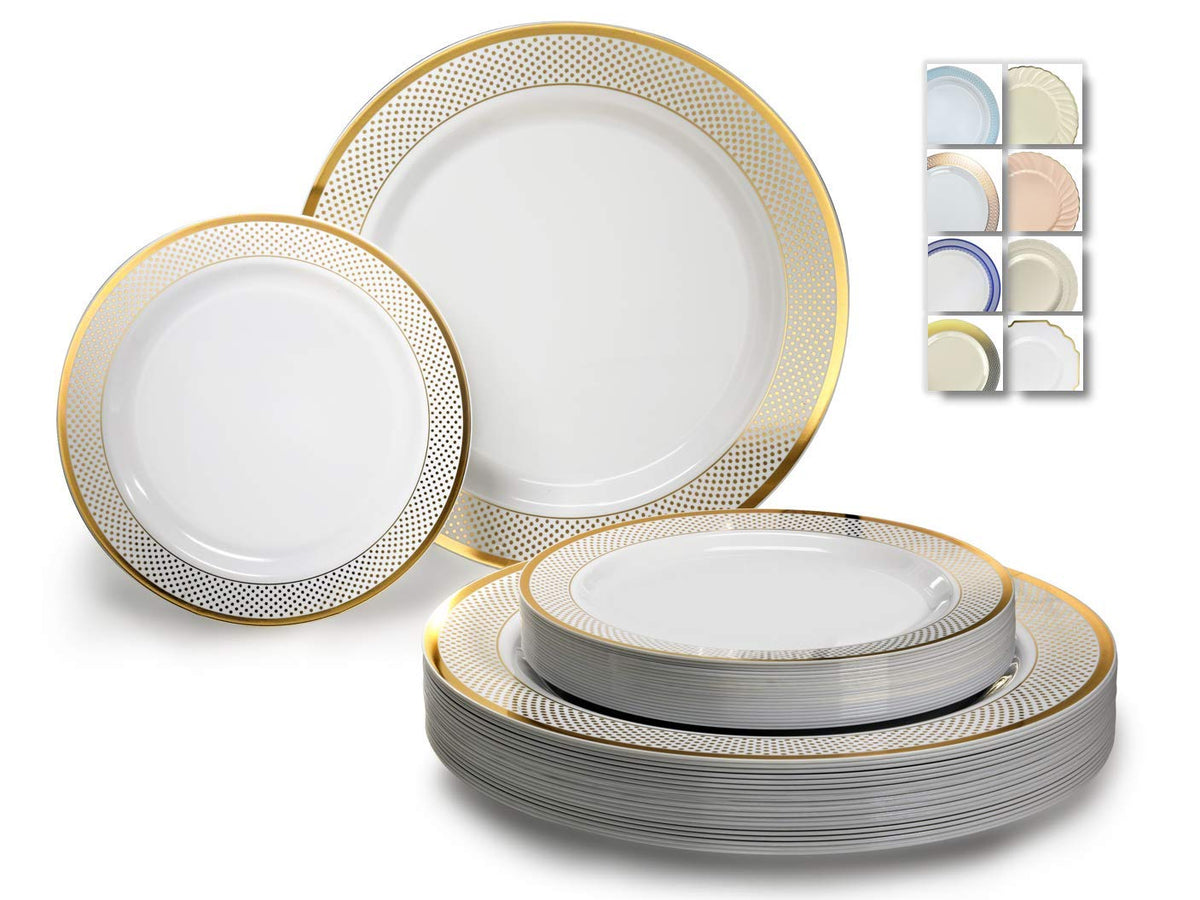 ' OCCASIONS '' 50 Plates Pack (25 Guests)-Heavyweight Wedding Party Disposable Plastic Plate Set -25 x 10.5'' Dinner + 25 x 7.5'' Salad/Dessert plates (Sundance in White & Gold)