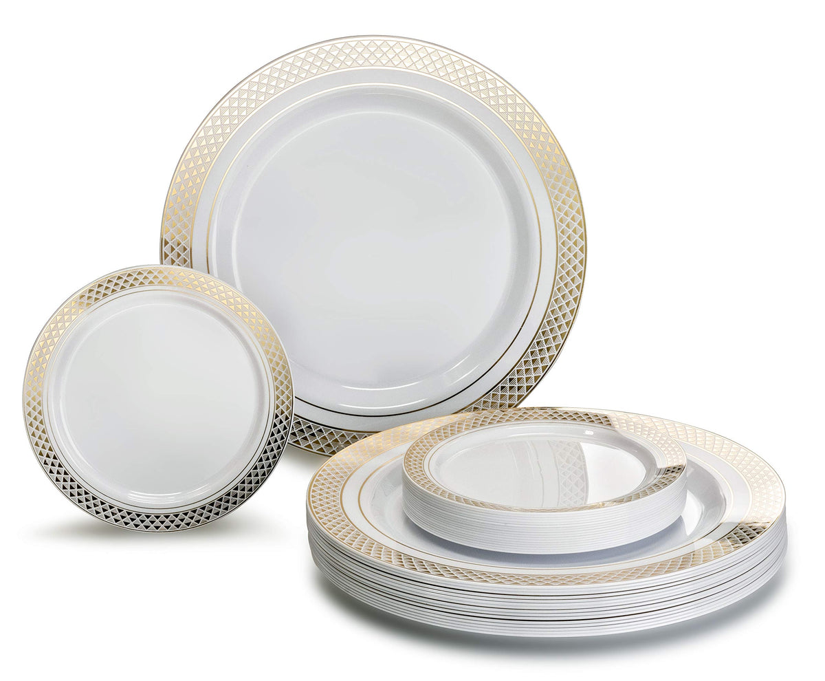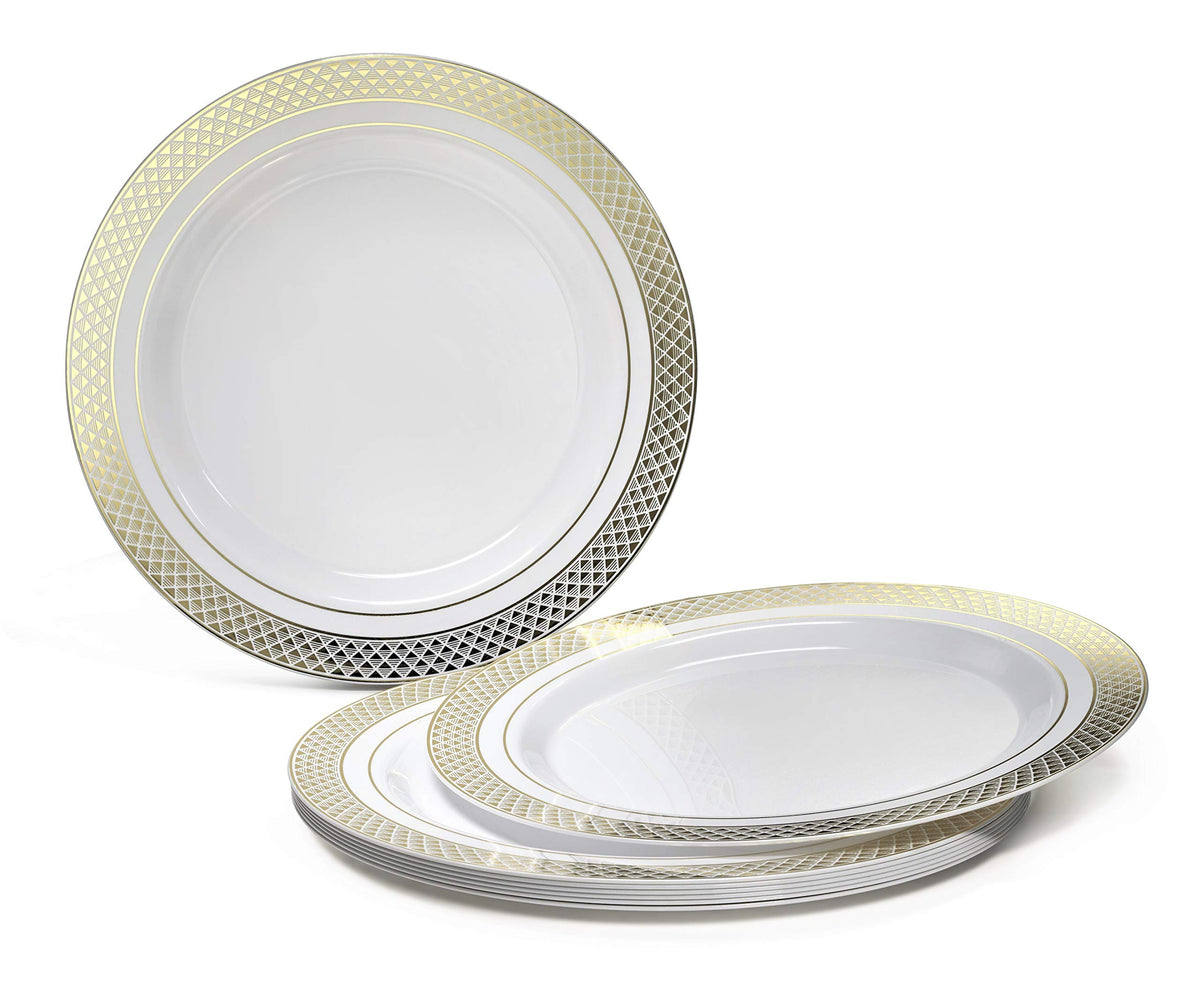 ' OCCASIONS '' 50 Plates Pack Heavyweight Premium Disposable Plastic Plates Set (25 x 10.5'' Dinner + 25 x 6.25'' Cake plates) (Celebration White & Gold)