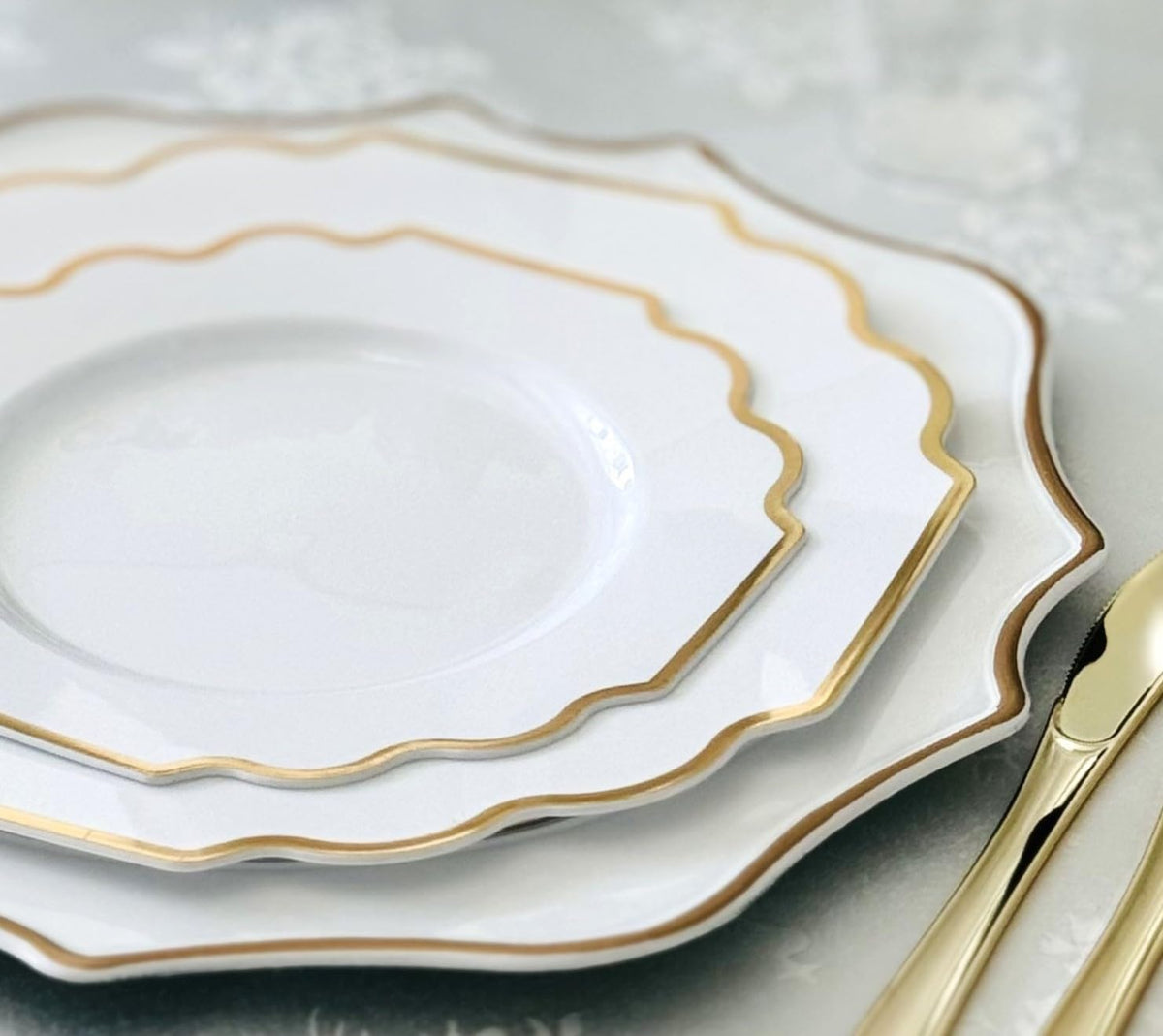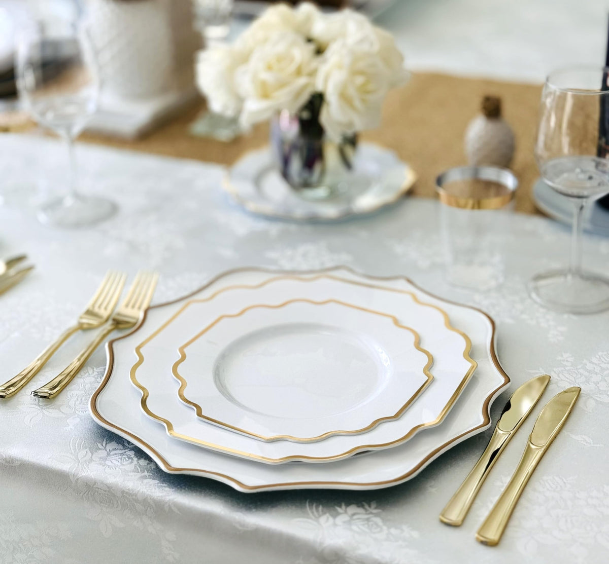 - Q: How can I enhance the presentation of the food served on these plates? A: To enhance presentation, consider using decorative tablecloths, elegant centerpieces, and coordinating napkins to complement the imperial white and gold design of the plates.