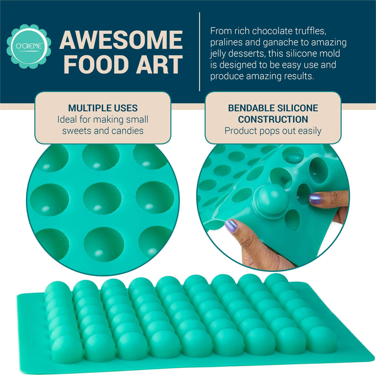 - Q: What can I make with the O’Creme Round Silicone Mold? A: The O’Creme Round Silicone Mold is ideal for creating chocolate truffles, ganache, jelly desserts, pralines, and caramels.