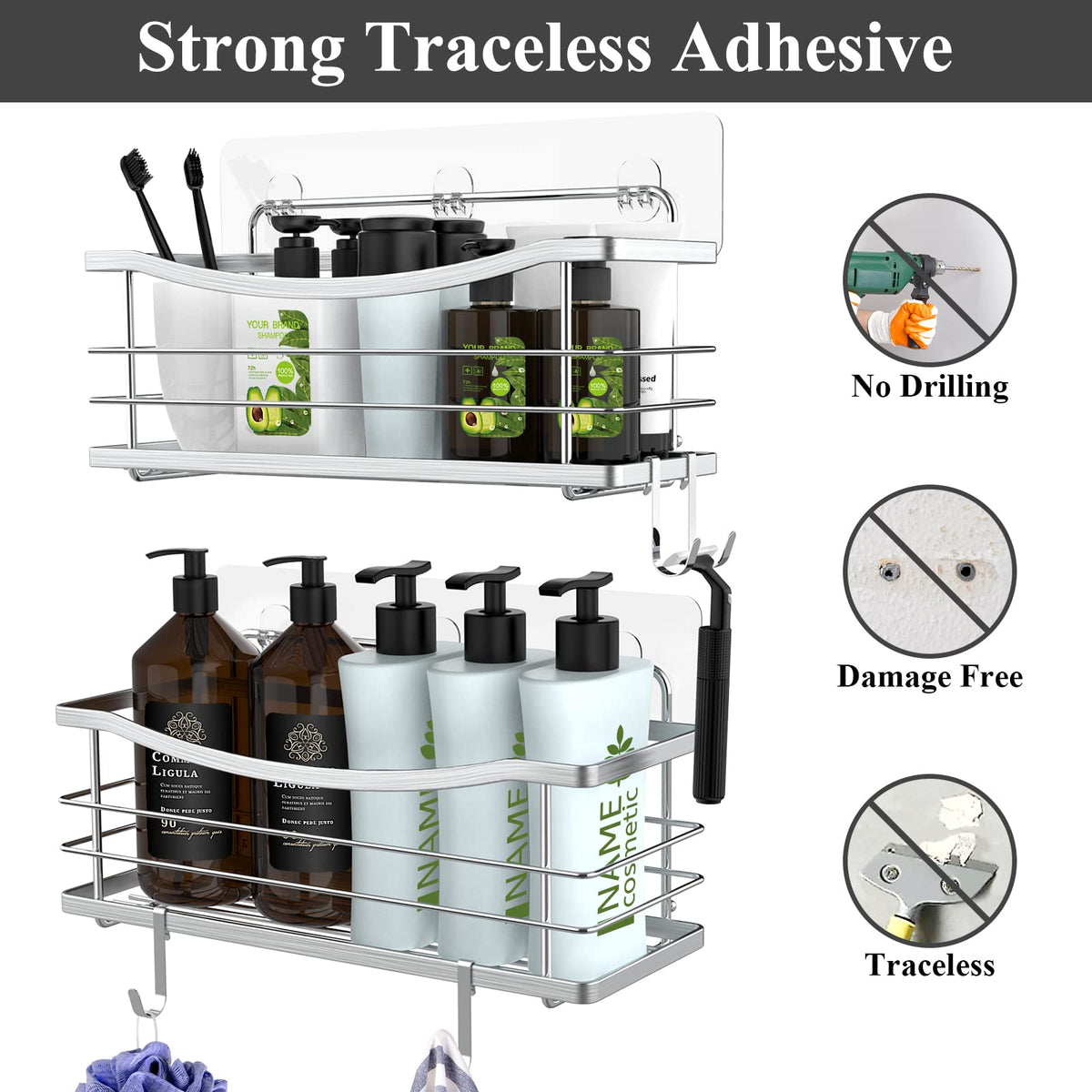 - Q: How do I install the shower caddy? A: Installation is easy and requires no drilling. Simply tear off the back cover, stick it to the wall, and hang the caddy. The included adhesives allow for a secure hold.