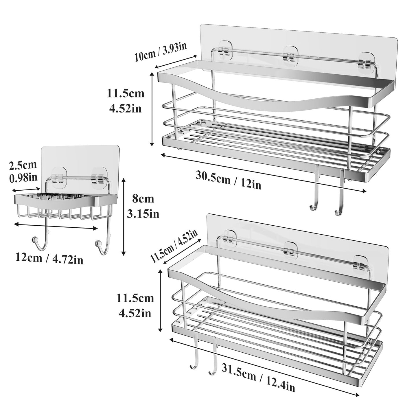 - Q: What is included in the package? A: The package includes 2 shower caddy baskets, 1 soap dish holder, 4 hooks, 5 adhesives, and a manual for installation.