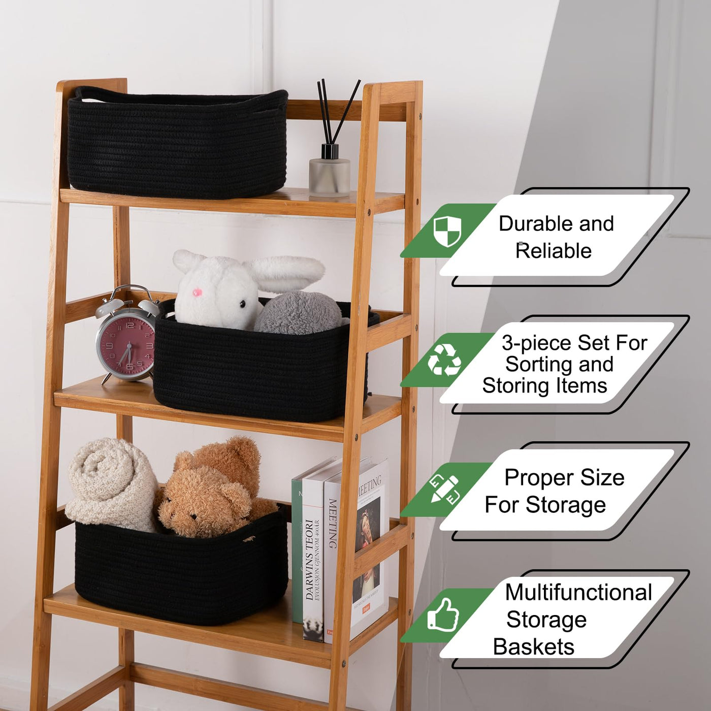 Oiahomy Cotton Rope Woven Baskets For Storage, Nursery Rectangle Storage Basket With Handles For Shelves, Pack Of 3, Black