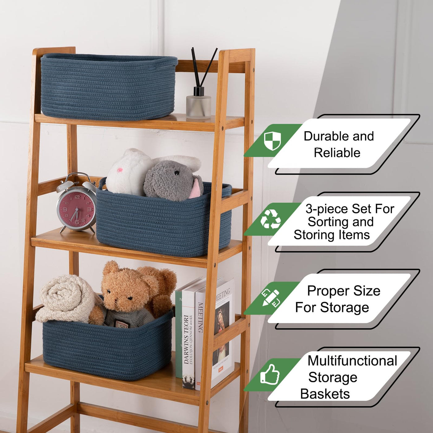 Oiahomy Cotton Rope Woven Baskets For Storage, Nursery Rectangle Storage Basket With Handles For Shelves, Pack Of 3, Blue