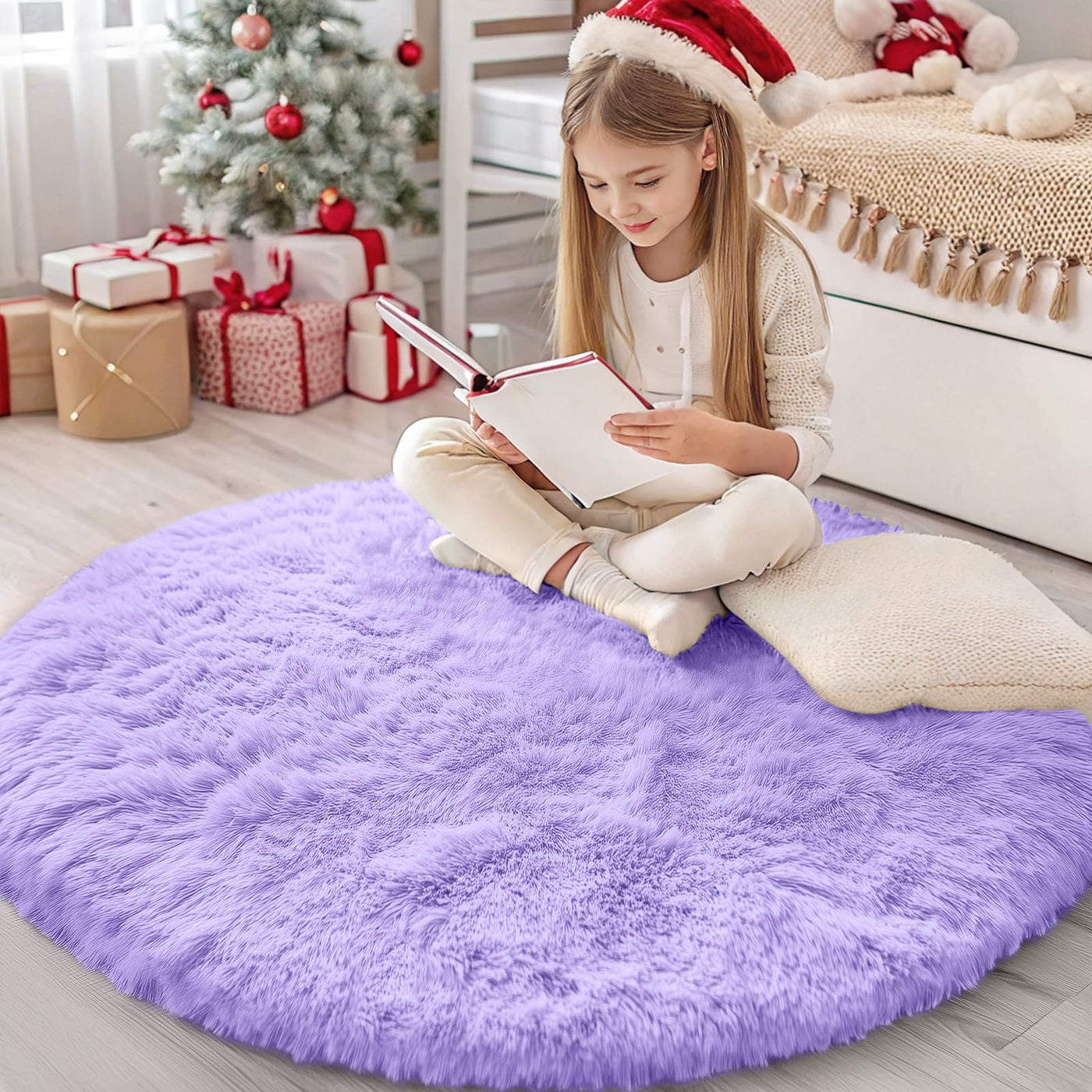 OLANLY Light Purple Round Rugs for Bedroom - Machine Washable, 4 ft Circle Area Rugs for Living Room, Soft and Fluffy Shaggy Car