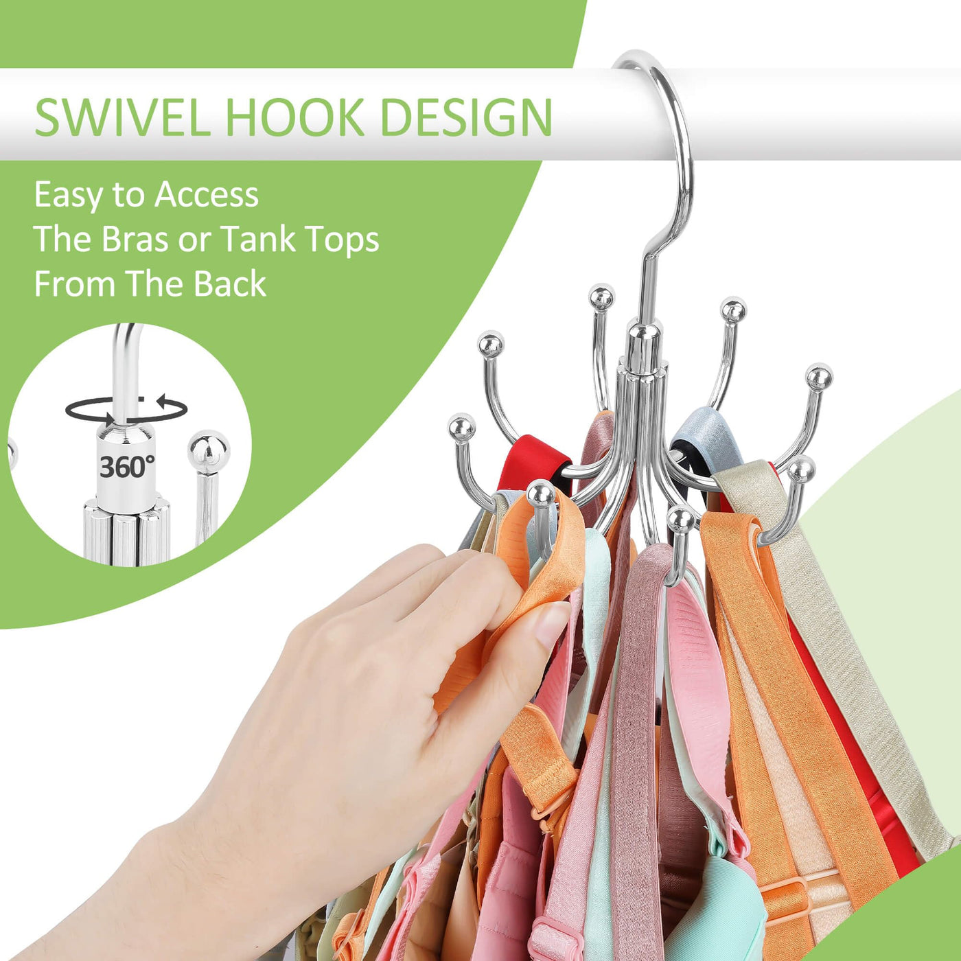 - Q: How does the 360° rotatable hook work? A: The 360° rotatable hook allows you to easily access your bras and tank tops from any angle, making selection quick and convenient.