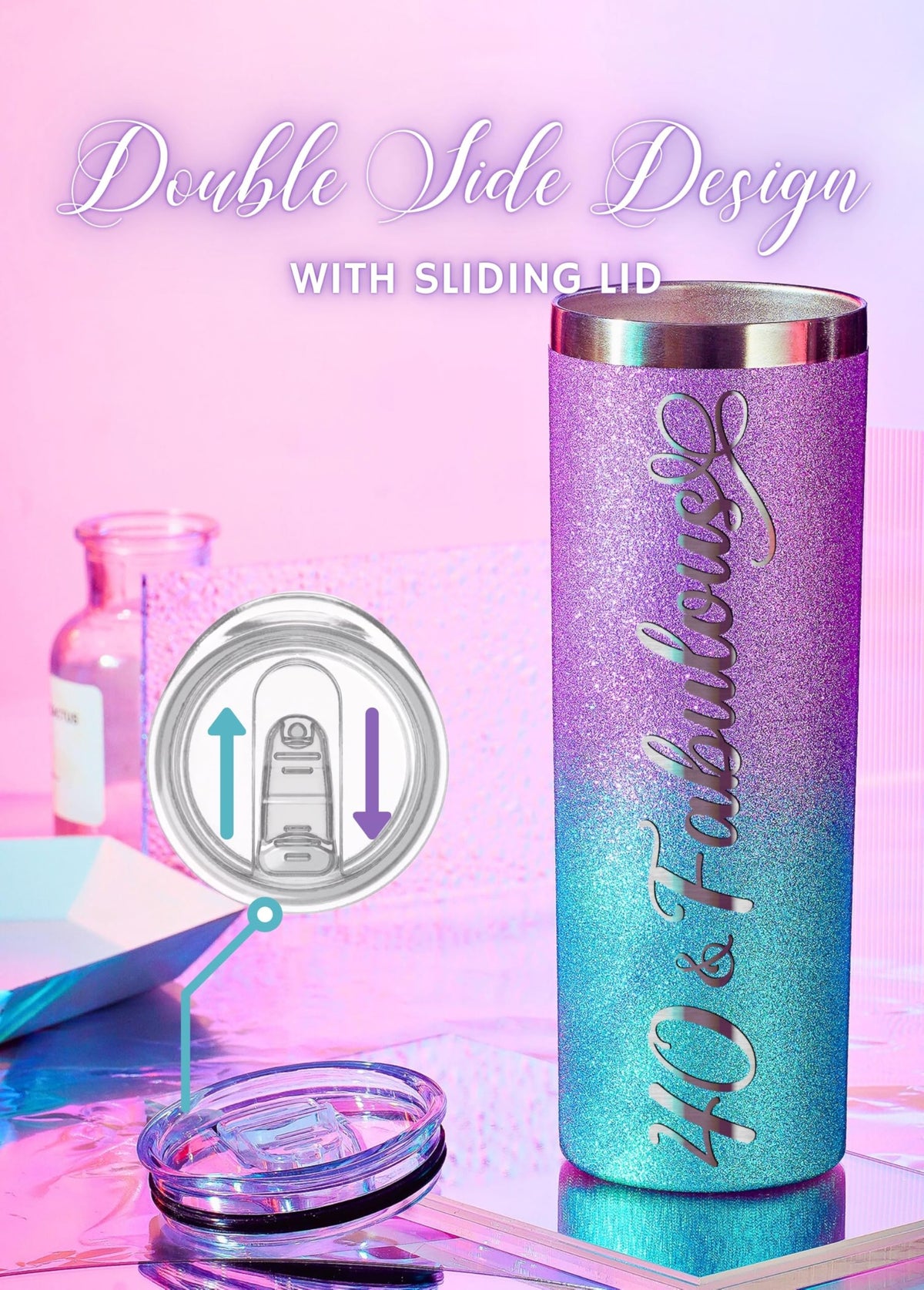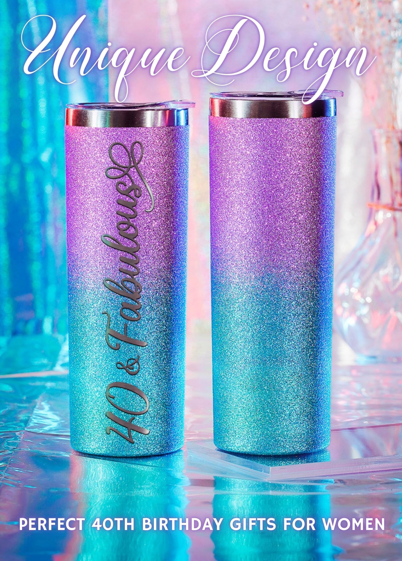 - Q: What is the design of the tumbler? A: The tumbler features a stylish purple-blue gradient glitter finish with the quote '40 & Fabulous' laser-engraved on the surface.