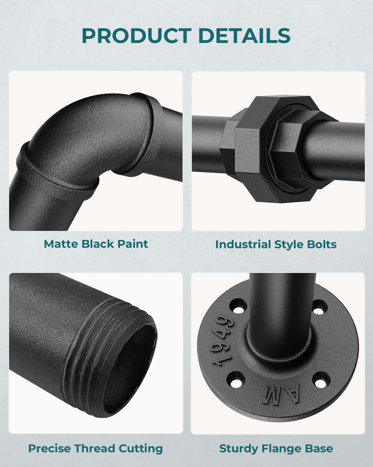 • Q: What materials is the clothing rack made from? A: The clothing rack is crafted from sturdy black rustic malleable iron, ensuring robustness and longevity.