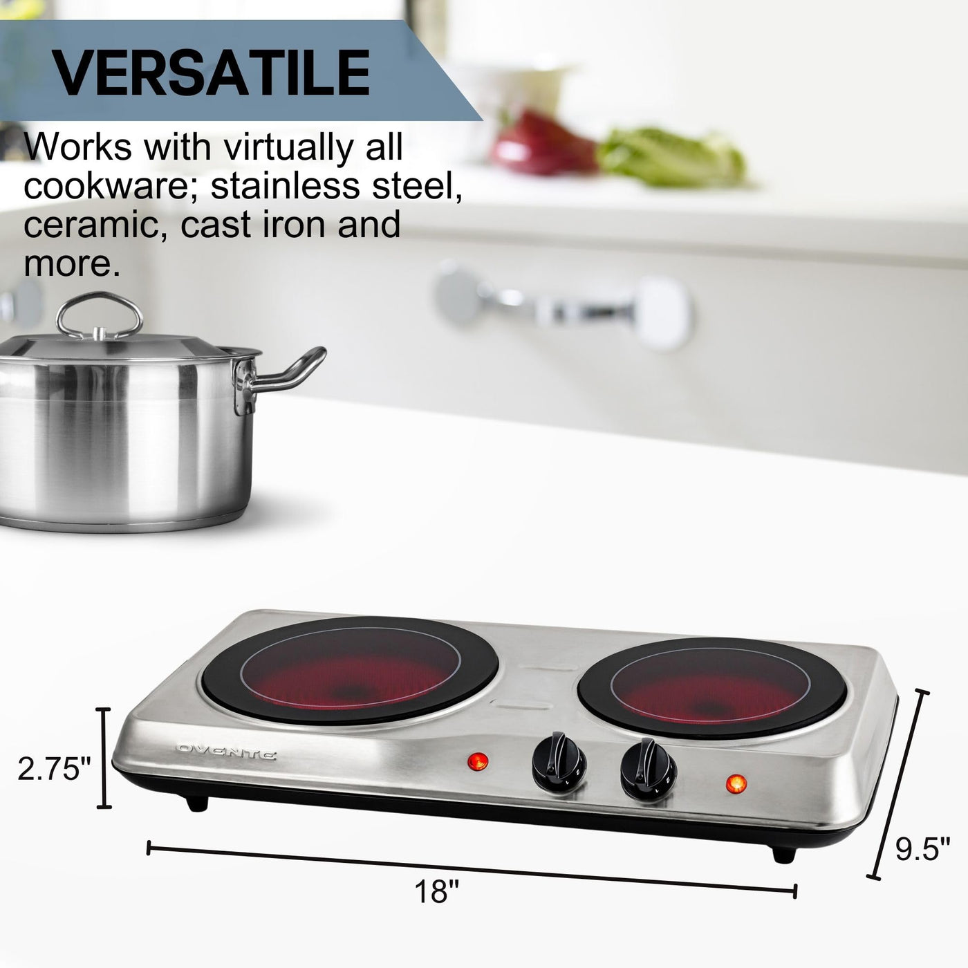 - Q: Is the OVENTE Double Burner easy to clean? A: Yes, the crystallite glass and stainless steel housing are easy to clean. Simply wipe them with a clean, damp cloth.