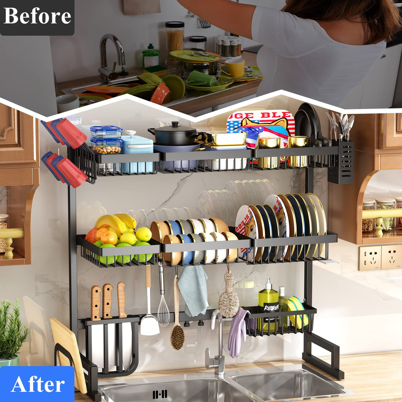 Over The Sink Dish Drying Rack, 3 Tier Adjustable (33.8 To 41.5 Inch) Large Capacity Kitchen Counter Dish Drying Rack With Fruit