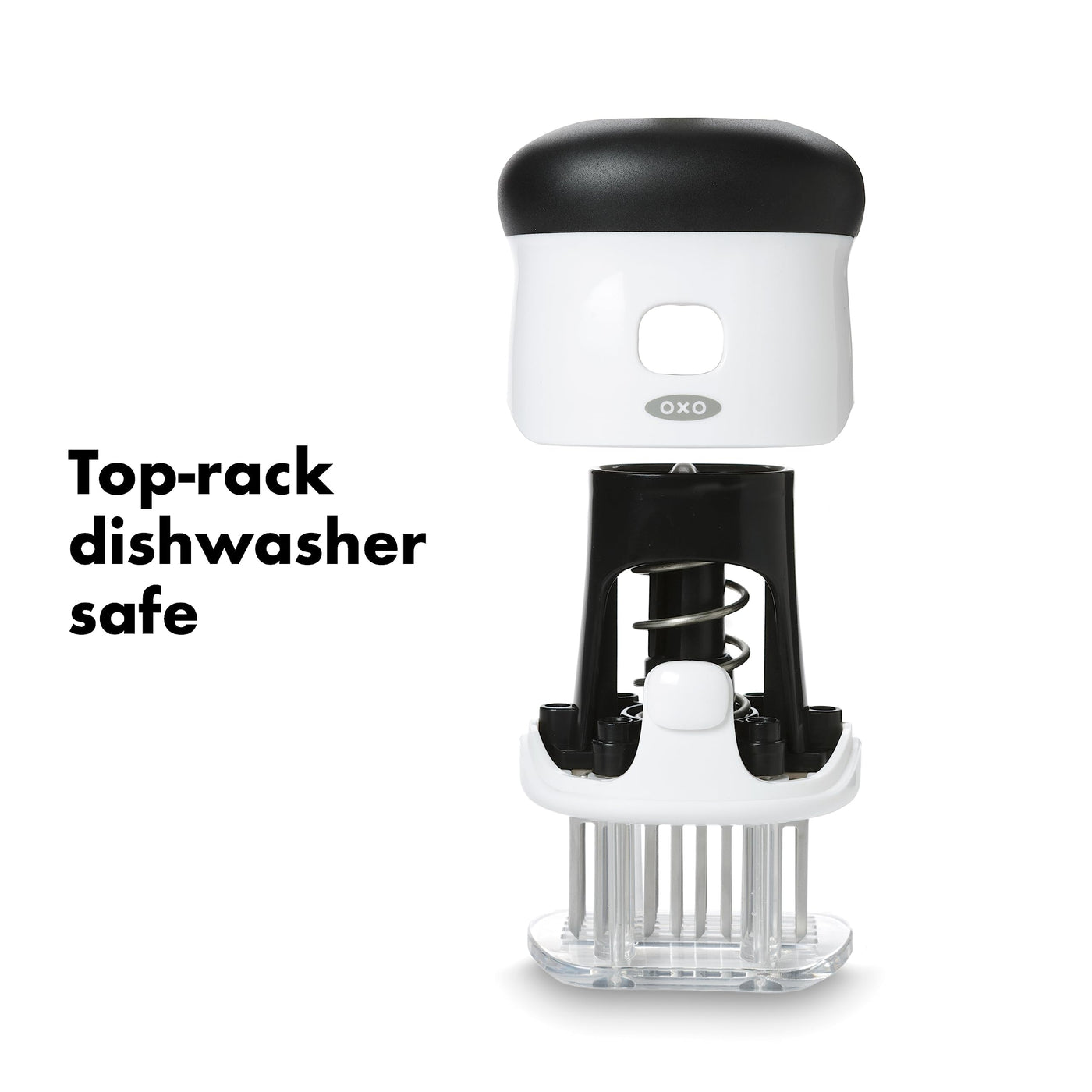 • Q: Can I wash the meat tenderizer in the dishwasher? A: Yes, the top of the meat tenderizer can be removed for thorough cleaning and it is top-rack dishwasher safe.