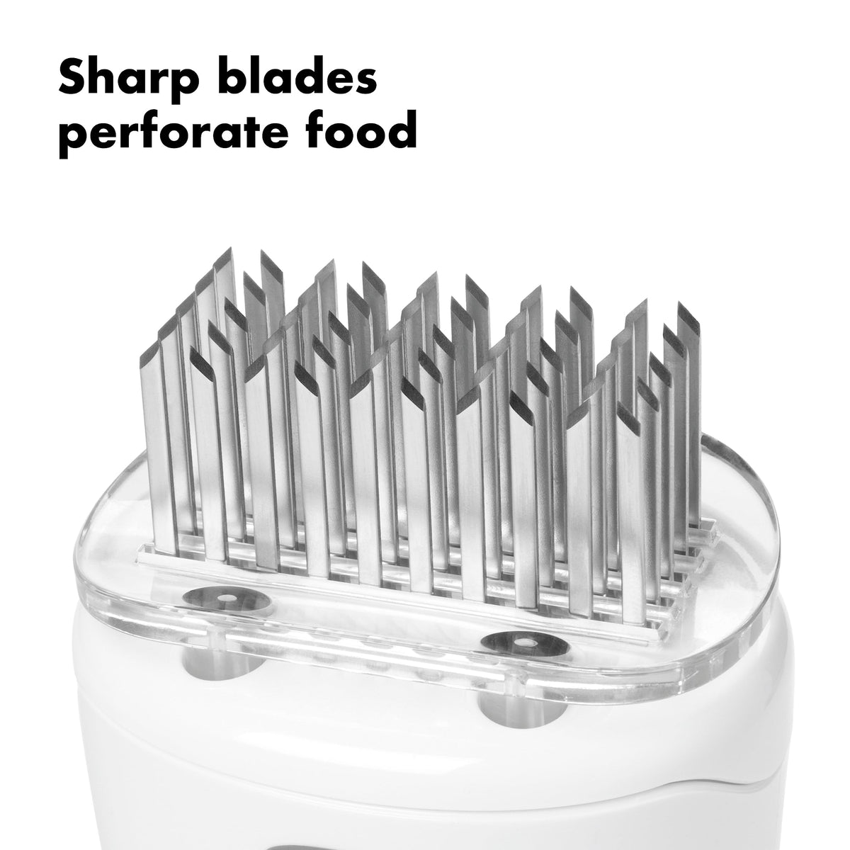 • Q: How many blades does the OXO meat tenderizer have? A: The OXO Good Grips Easy-Clean Bladed Meat Tenderizer features a total of 50 sharp, durable blades.
