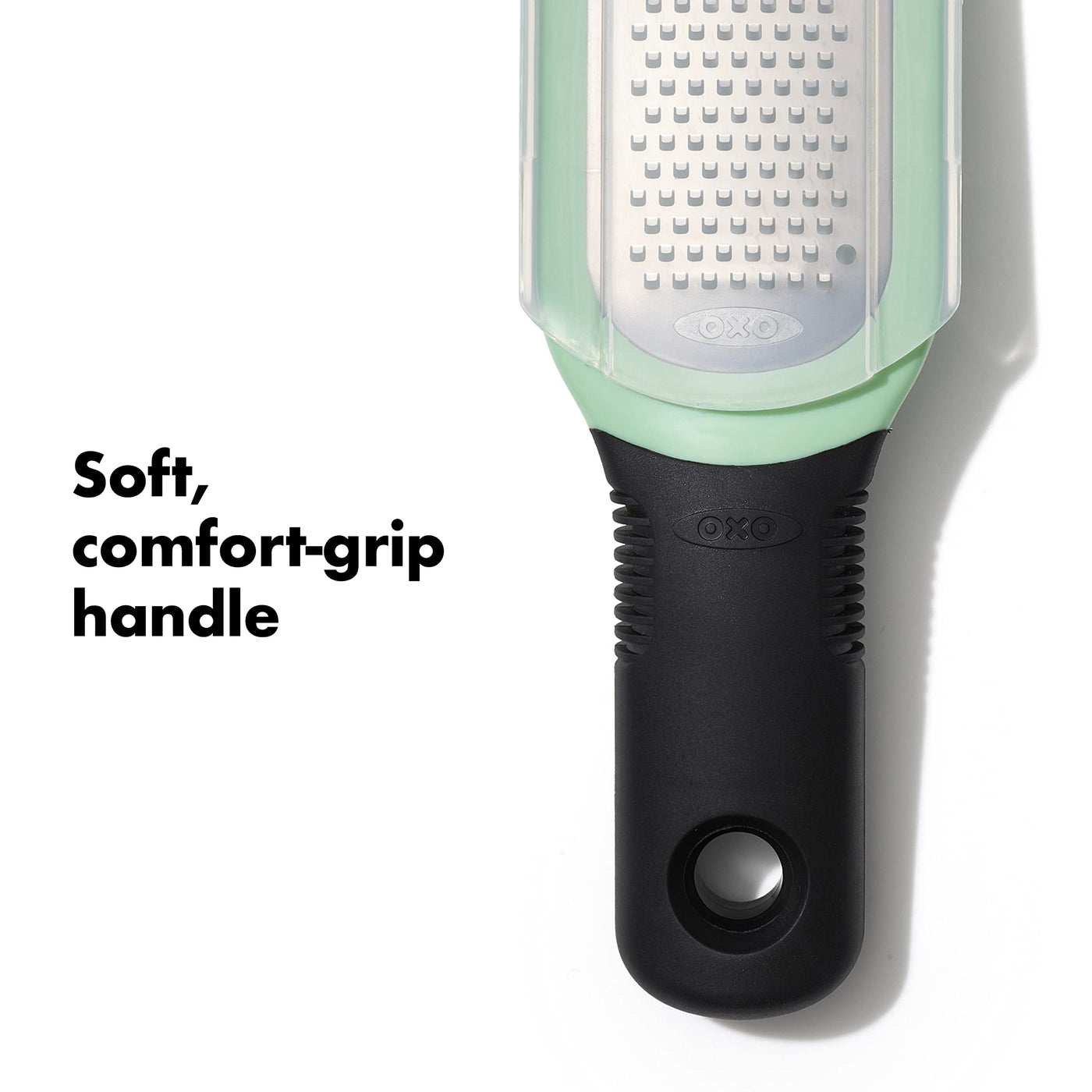 • Q: Is the handle of the OXO Good Grips Grater designed for comfort? A: Yes, the grater features a soft, non-slip handle that provides a comfortable grip during use.
