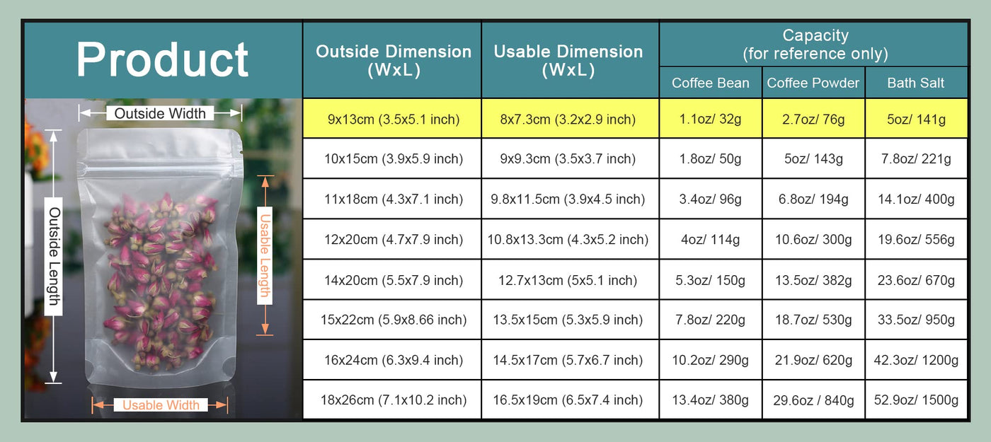 - Q: What are the dimensions of the resealable stand up bags? A: The resealable stand up bags measure 3.5 inches by 5.1 inches.