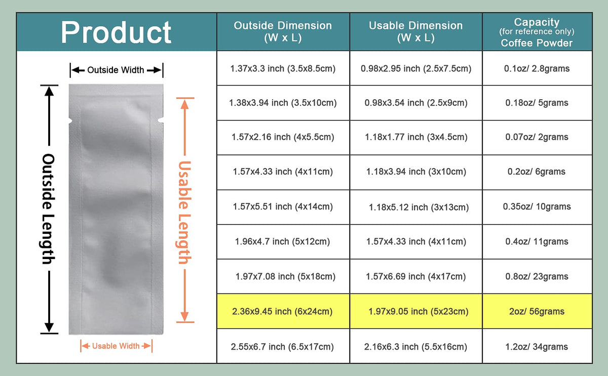 - Q: What are the dimensions of the bag? A: The bag measures 2.36 x 9.45 inches on the outside. The inside dimensions are approximately 1.97 x 9.05 inches.