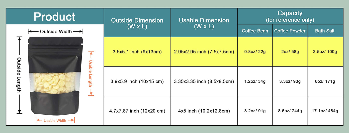 - Q: What are the dimensions of the PABCK resealable stand up bags? A: The outside dimensions of the bags are 3.5 inches by 5.1 inches, while the inside dimensions are 3.1 inches by 3.94 inches.