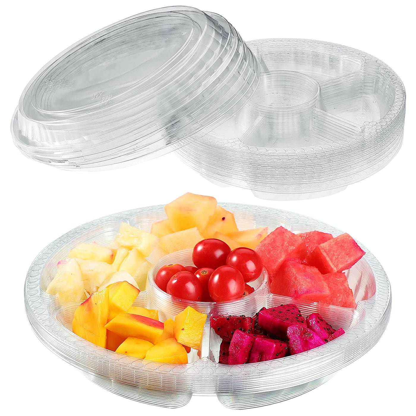 Patelai 10 Pcs Plastic Veggie Tray With Lid Fruit Trays Round Disposable Appetizer Serving Trays With 6 Divided Compartment For