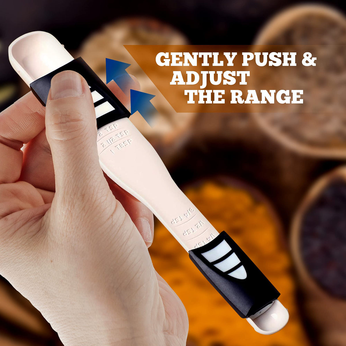 - Q: How does the adjustable feature of the measuring spoon work? A: The spoon has an adjuster that allows you to slide to your desired measurement. One side measures in teaspoons and the other in smaller increments, making it versatile for various recipes.