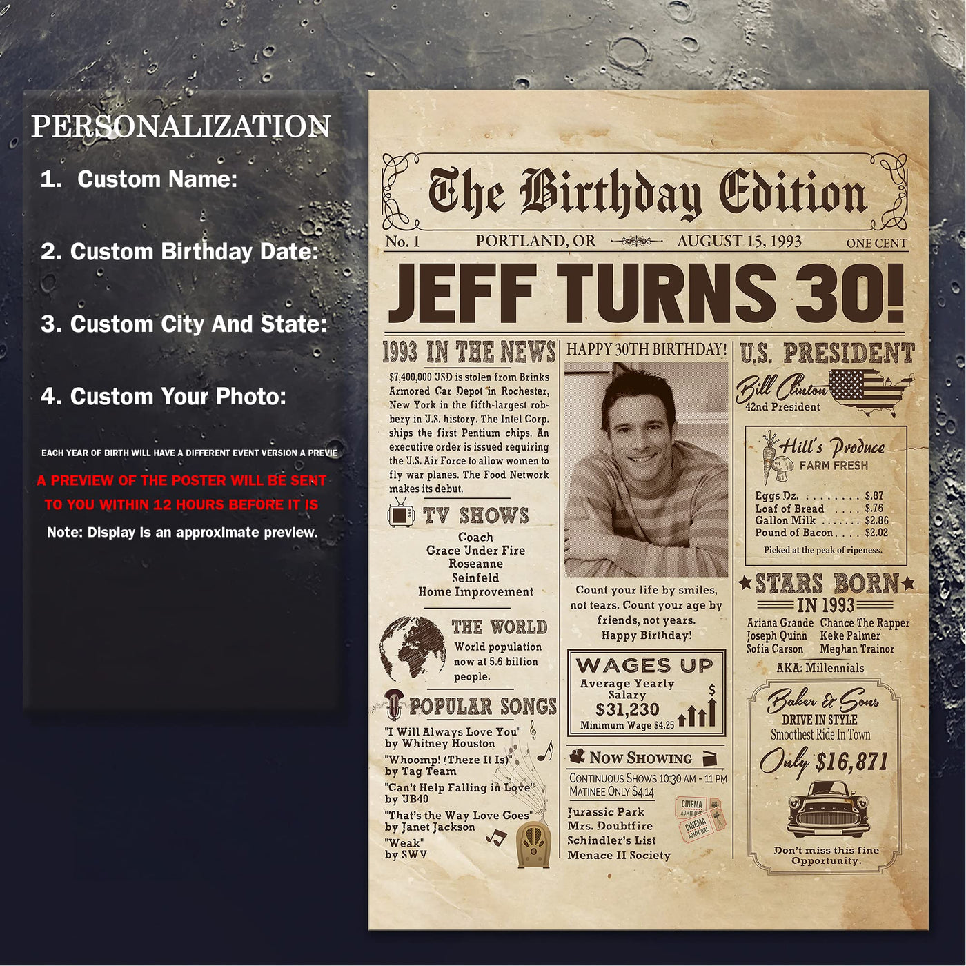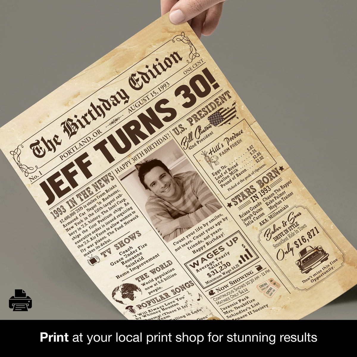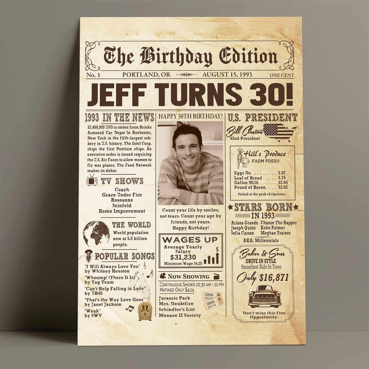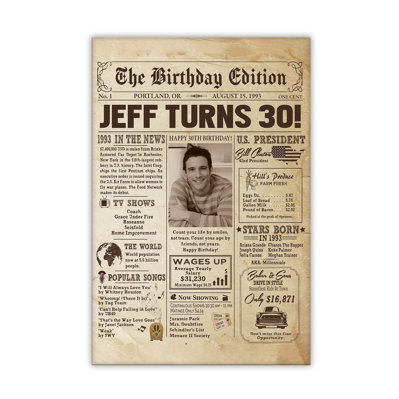 Personalized 30Th Birthday Newspaper Poster No Frame, Canvas Back In 1993 Gifts Idea Birthday, Anniversary, Custom Photo Birthda