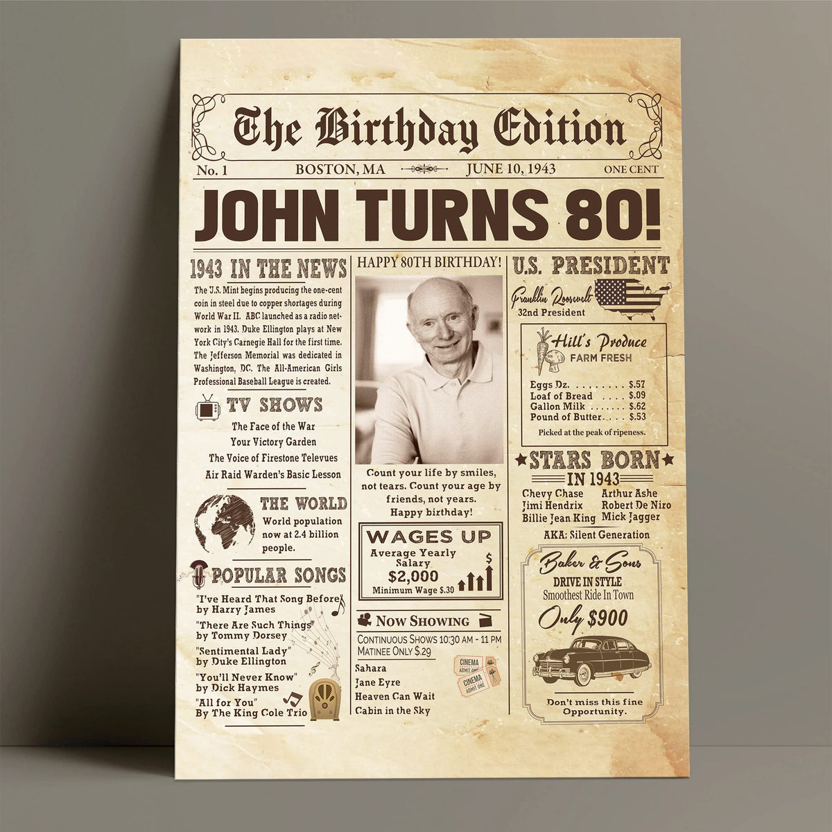 Personalized 80Th Birthday Newspaper Poster No Frame, Canvas Back In 1943 Gifts Idea Birthday, Anniversary, Custom Photo Birthda